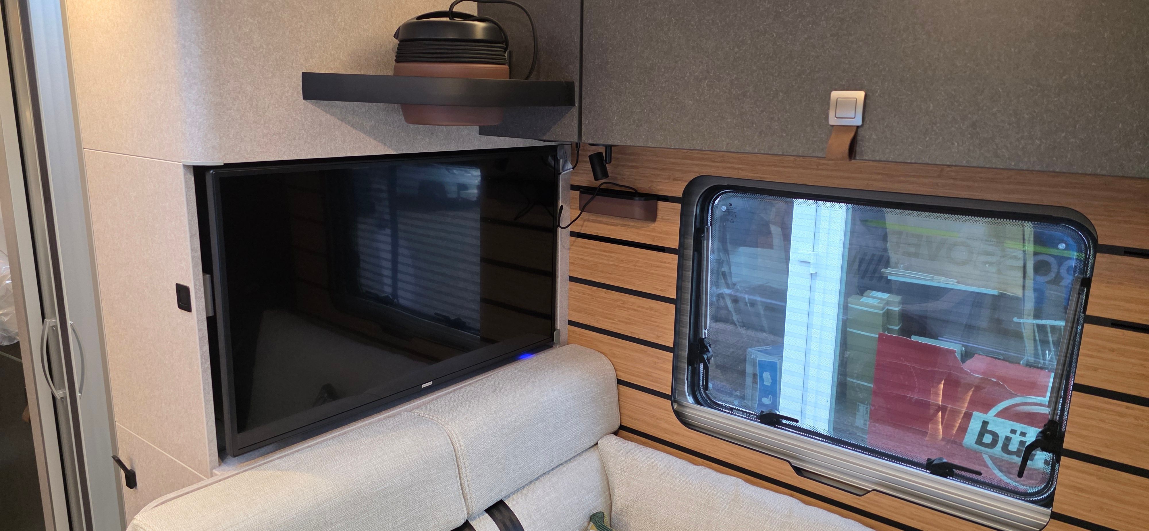 32 colių išmanusis LED televizorius su įmontuotais garsiakalbiais, nuotolinio valdymo pultu, HYMER išmanioji multimedijos sistema su „Bluetooth®“ (DVB-T / C, DVB-S2), elektriniu laikikliu ir imtuvu